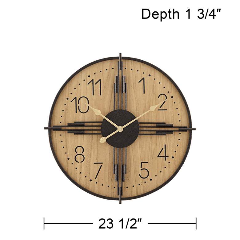 - 23.5" wide and high x 1.75" deep. Clock face only is 22.5" wide x 22.5" high. Weighs 7.01 lbs.