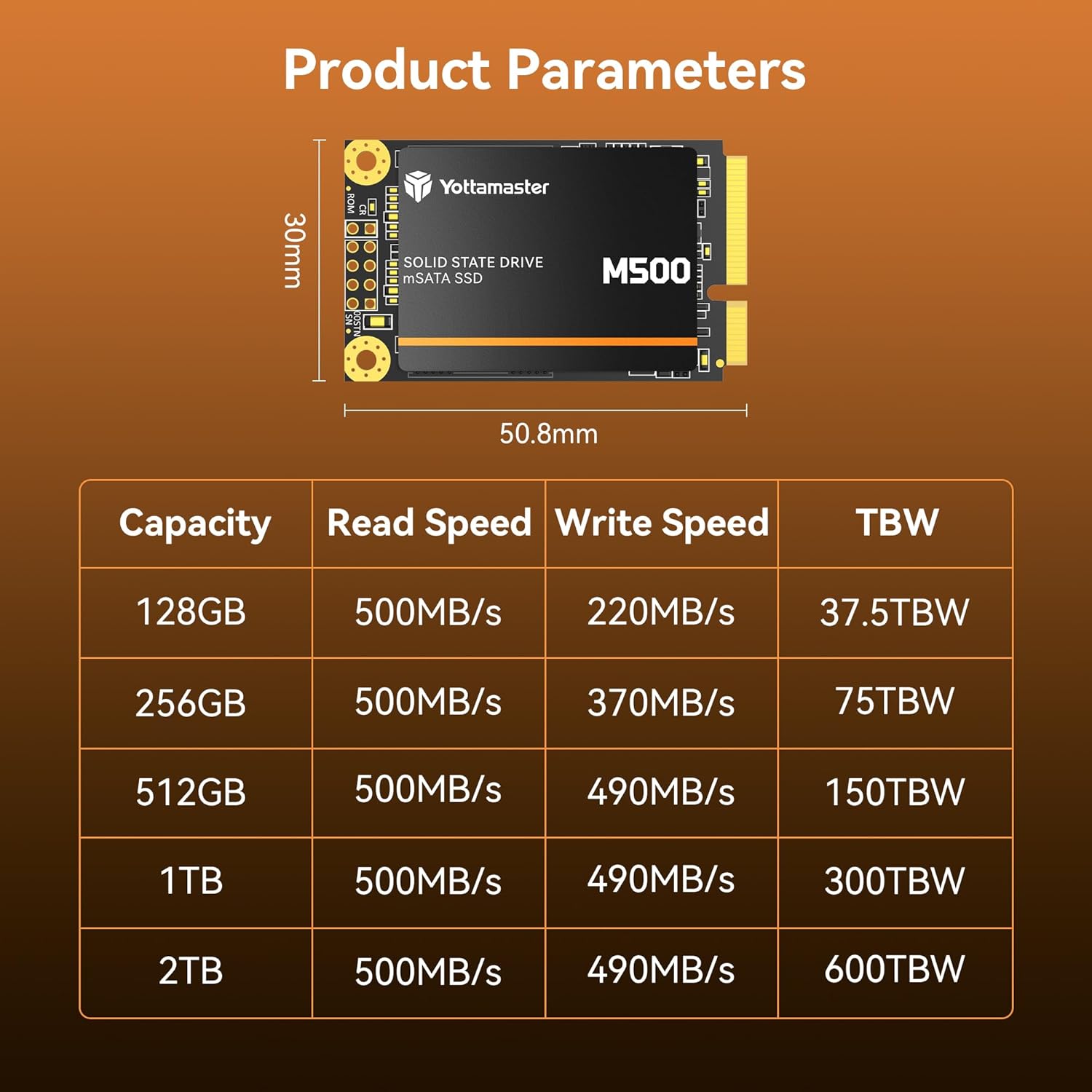 - 【Compact and Reliable】Yottamaster mSATA SSD features a 50*30mm compact size, equipped with a SATA III interface at 6Gbps. Yottamaster M500 1TB mSATA SSD provides a 3-year limited warranty service or a 300TBW durability rating.